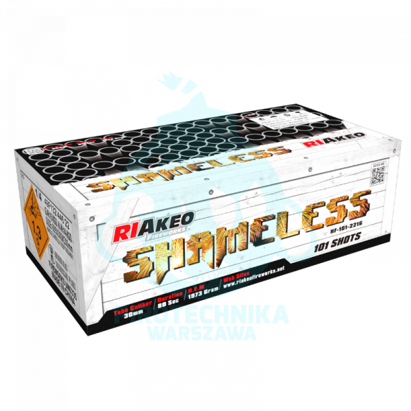 Riakeo Fireworks Shameless 101S HF-101-2216 to efektowna bateria złożona (compound) o wyraźnie profesjonalnym charakterze, zaprojektowana z myślą o intensywnych, dynamicznych pokazach pirotechnicznych. Zestaw składa się ze 101 potężnych strzałów o kalibrze 30 mm, które tworzą spójną, rozbudowaną choreografię o dużym zasięgu i sile oddziaływania wizualnego.