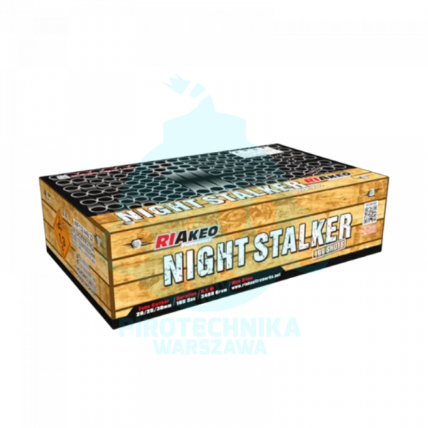 „Night Stalker Riakeo” to widowiskowy, ponad 100-sekundowy pokaz łączący trzy różne kalibry – 20, 25 i 30 mm – w jednym, dynamicznym show. 199 strzałów o zróżnicowanej intensywności i wysokości wznosu wypełnia niebo feerią barw i efektów. Doskonały wybór na finał imprezy, wesela, sylwestra czy festynu.